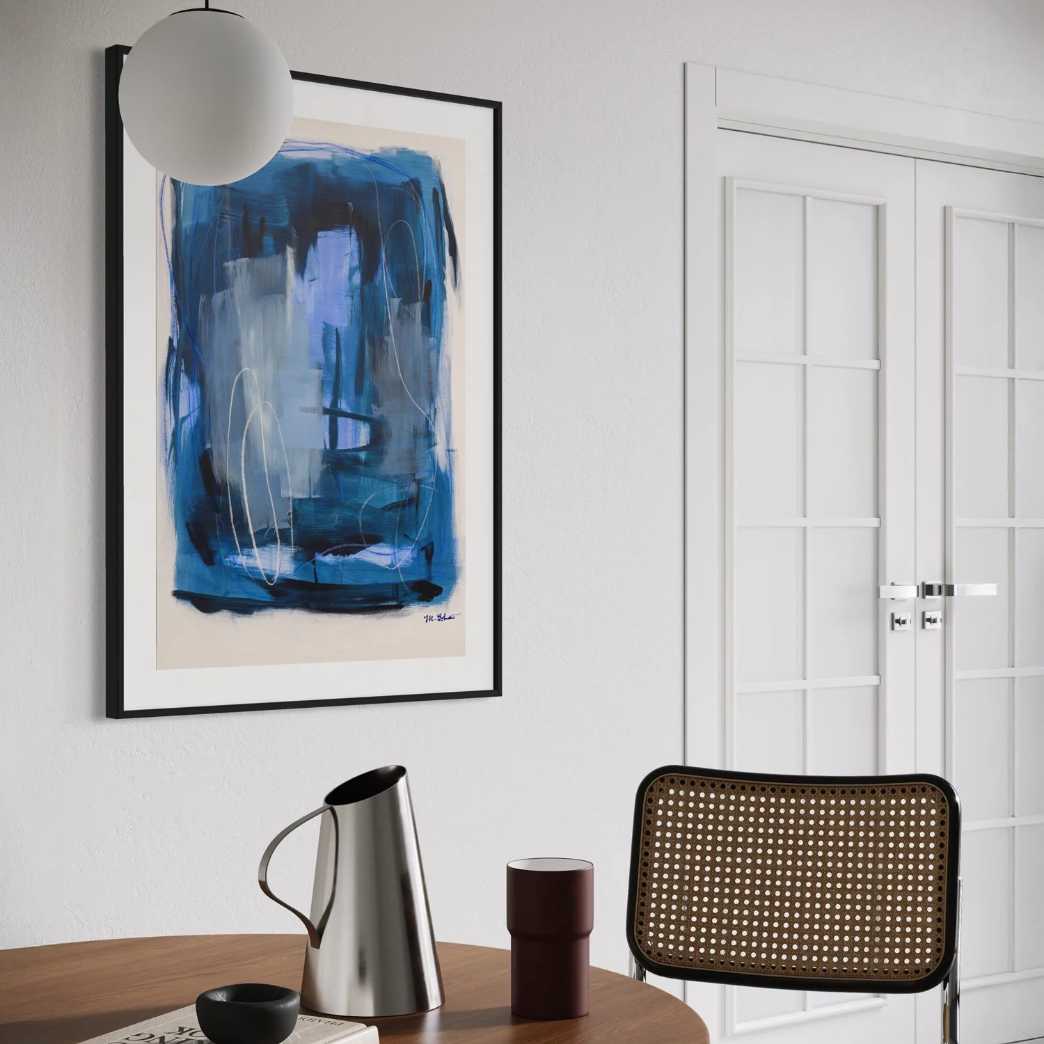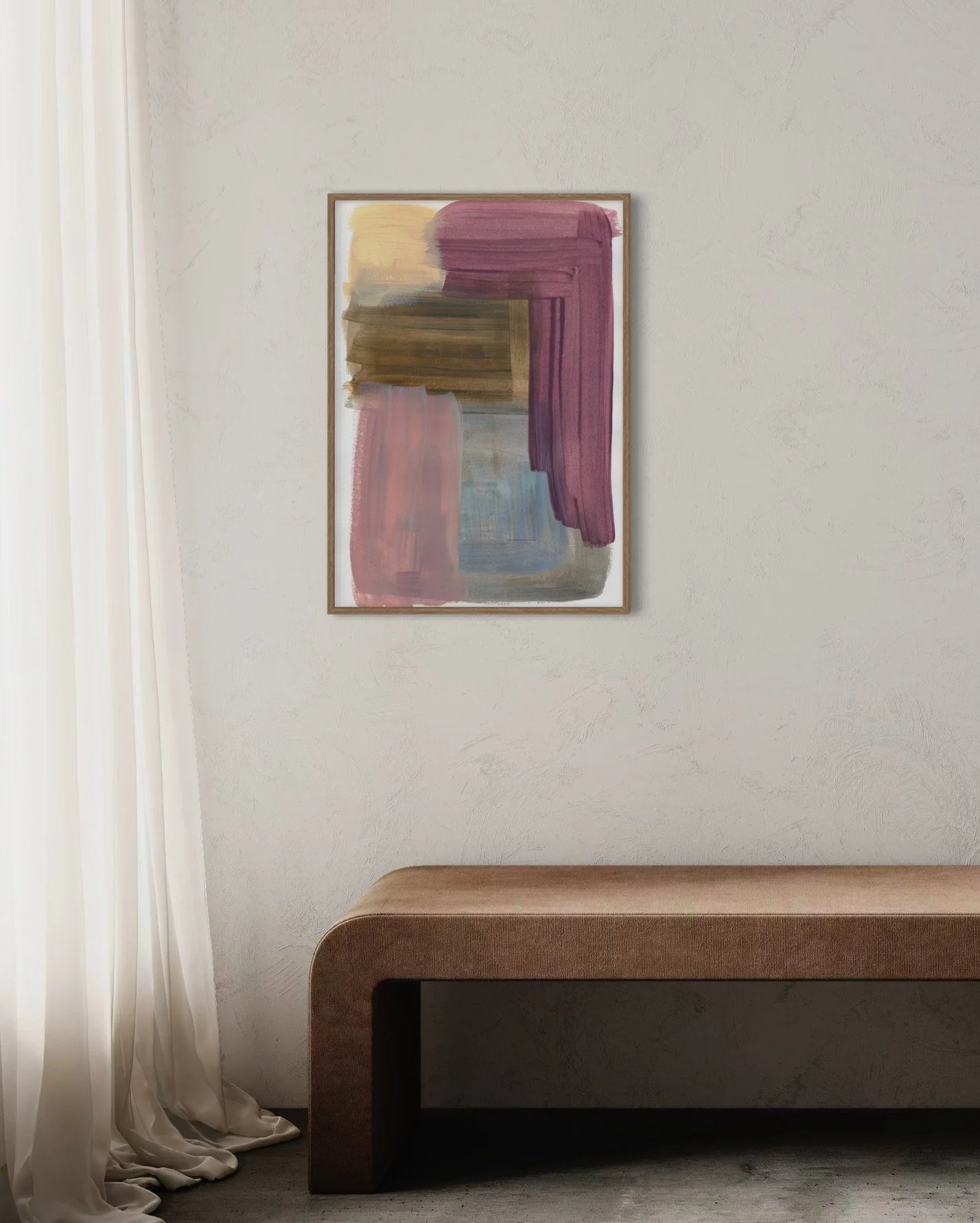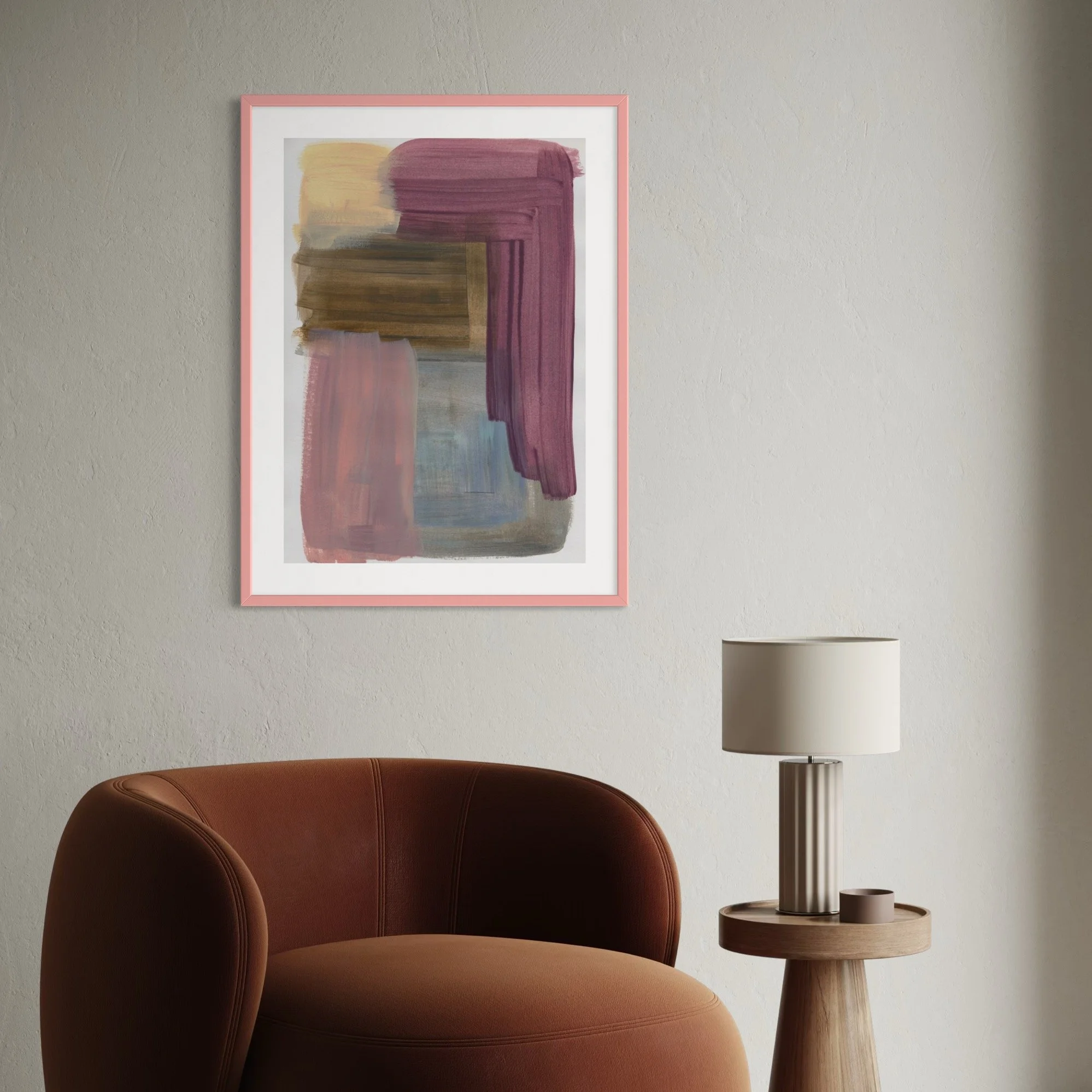 This artwork combines warm earthy browns, deep blues, and muted greys with soft pink linework. The geometric brushstrokes are contrasted by the curved, hand-drawn shapes, creating a balance between structure and fluidity. Minimalist yet expressive, the artwork conveys a calm, modern atmosphere that works beautifully in both contemporary and timeless interiors.